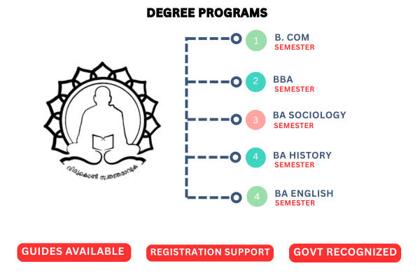 We offer programs in collaboration with reputable universities such as IGNOU, Pondicherry University, and Sree Narayana Guru Open University, ensuring that your degree is nationally recognized and valued.